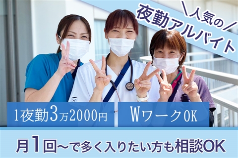 月1回〜で多く入りたい方も相談OK◎1夜勤3万2000円!パートも賞与実績2ヶ月分あり★第二新卒可能!WワークOK◇マイカー通勤可!入職お祝い金あり◎社会保険加入OK【横須賀市、病院/病棟、看護師、夜勤アルバイト】