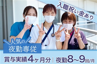 月収36万円・44万5000円可能+賞与4ヶ月実績★夜勤専従!残業ほぼなし◎月8〜9回勤務◆第二新卒OK◎入職お祝い金あり【横須賀市、病院/病棟、看護師、夜勤専従常勤】