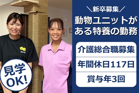26卒・新卒求人◎髪型髪色自由!サポートスタッフ配置&ICT導入で負担軽減◇賞与年3回実績♪年間休日117日★動物ユニットのある特養で介護職デビュー【狭山市、入曽駅、特養、介護職員(新卒)、正職員】